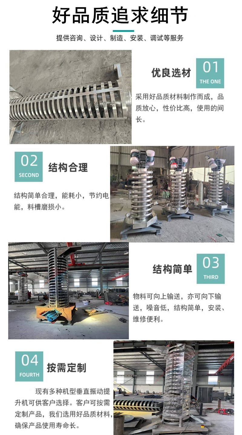 塑料顆粒降溫輸送機 DZC-800螺旋垂直提升機采用振動電機作為振動源,17719958219 固定在提升槽上的兩臺相同型號的振動電機中心線交叉一定角度安裝,并做相反方向自同步旋轉(zhuǎn),振動電機所帶的偏心塊在旋轉(zhuǎn)時各個瞬間位置所產(chǎn)生的離心力之分力沿拋擲方向作往復(fù)運動,使支承在減振器上的整個機體不停振動,使物料在提升槽內(nèi)被拋起的同時向上運動,物料落入入料槽后,開始被拋起,此時可以使物料與空氣充分接觸,還可以起到散熱冷卻的作用。