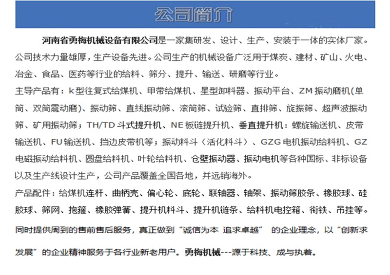 河南省勇梅機械設備有限公司位于新鄉(xiāng)市牧野區(qū)寺莊頂工業(yè)園內(nèi),是一家主營k型給煤機、斗式提升機、星型卸料器、振動磨機、振動平臺、振動料斗、振動篩、旋振篩、滾筒篩、直線振動篩、礦用振動篩、FU輸送機、螺旋輸送機、振動電機的廠家,產(chǎn)品廣泛銷售至化工、食品、鑄造、鋼廠、水泥、冶金、建材鐵等大中小型企業(yè),并取得了良好的信譽。 公司自成立以來,非常注重材料、標準件等的質量把關,嚴禁使用質量次的非正規(guī)廠商的物件,以確保產(chǎn)品的優(yōu)良品質,使得我們的產(chǎn)品得到各行業(yè)用戶的信賴,取得了良好的經(jīng)濟效益和社會效益。 河南勇梅機械期待您的來電 聯(lián)系電話:17719958219郭經(jīng)理(微信同號)
