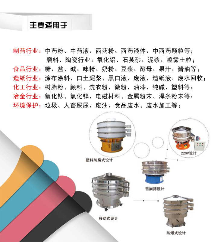 奶粉振動篩根據(jù)不同的應用分為普通型、閘門型、加緣型以及超聲波型等。普通型振動篩主要針對通用粉體、小顆粒物料的篩分作業(yè)。閘門型振動篩是在實際應用中衍生的一種產品,多用于超輕、超細物料的篩分,用戶可以一次投料有效篩分作業(yè),同過控制閘門的開合以達到良好篩分的目的,這種篩分作業(yè)多用于中藥粉、花粉等行業(yè)。加緣型旋振篩是在普通型旋振篩的基礎上增大入料口,并通過特殊角度設計以防止液體飛濺的過濾型篩分設備,在油漆、水過濾、紙漿過濾等行業(yè)有著廣泛的應用。