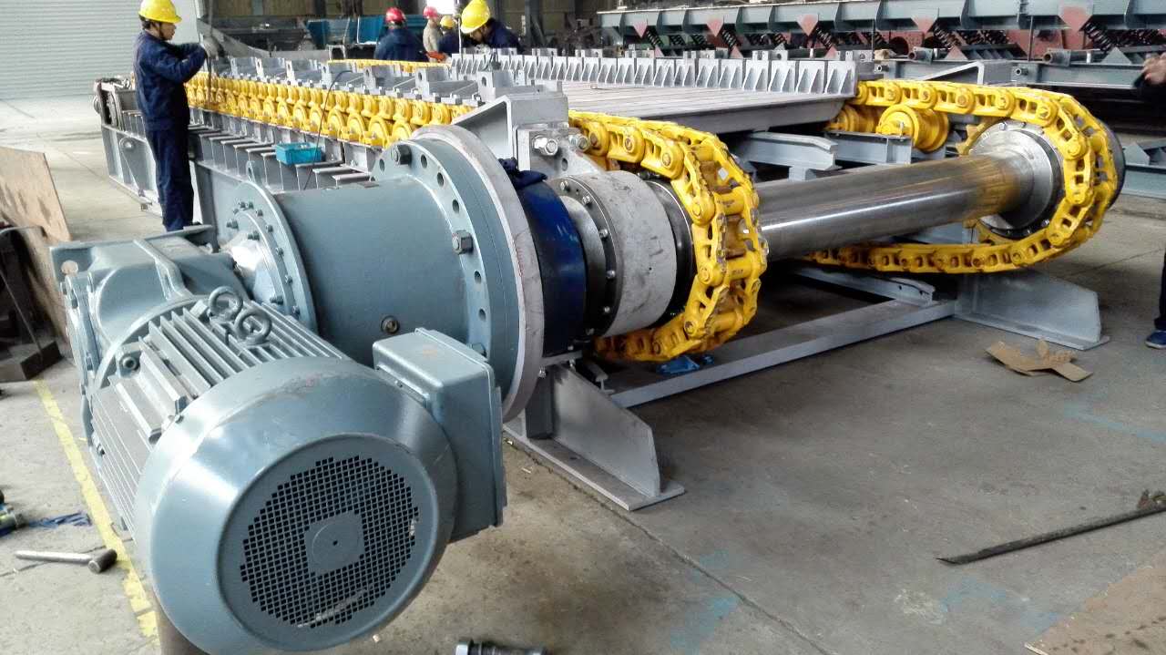 板式給料機(jī)的動(dòng)力由傳動(dòng)裝置的電動(dòng)機(jī)驅(qū)動(dòng),經(jīng)減速機(jī)減速后,再經(jīng)安全聯(lián)軸器把動(dòng)力傳到主動(dòng)軸上。此時(shí),裝在主動(dòng)軸上的兩個(gè)鏈輪就跟軸轉(zhuǎn)動(dòng)。另外與頭部、尾部鏈輪相嚙合的兩條鏈條也隨著主動(dòng)鏈輪和尾輪的轉(zhuǎn)動(dòng)而向前移動(dòng),鏈板安裝在鏈條上面與鏈條作同步運(yùn)動(dòng)。