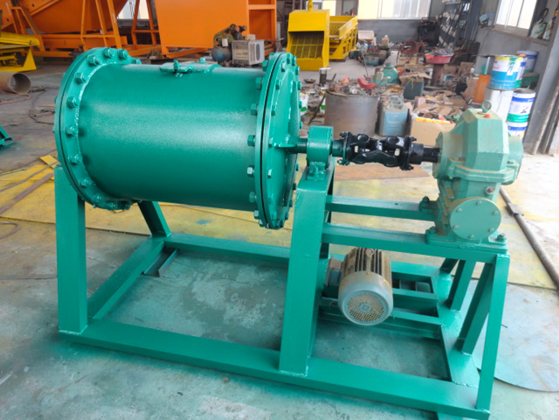 混汞機(jī)是一種金選廠廣泛應(yīng)用的內(nèi)混汞設(shè)備,用于處理砂金礦的含金重礦和脈金礦山的重選金精礦?;焱餐不旃鸬幕厥章士蛇_(dá)98%以上,是一種高效的內(nèi)混汞設(shè)備。重選金精礦中雖然大部分金呈游離態(tài)存在,但金粒表面常受不同程度的污染,而且部分金與其他礦物或脈石呈連生體形態(tài)存在,處理含表面潔凈的游離金粒的重礦精礦時,一般采用輕型混汞筒,裝球量較少,處理連生體含量較高,金粒表面污染嚴(yán)重的重礦精礦時,常采用重型混汞筒。