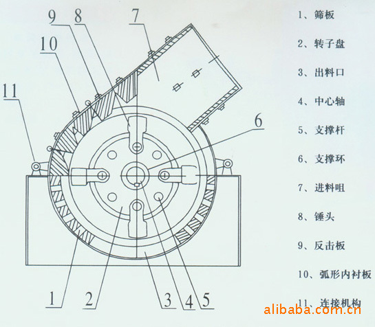錘式破碎機(jī)結(jié)構(gòu):錘式破碎機(jī)箱體、轉(zhuǎn)子、錘頭、反擊襯板、篩板等組成。