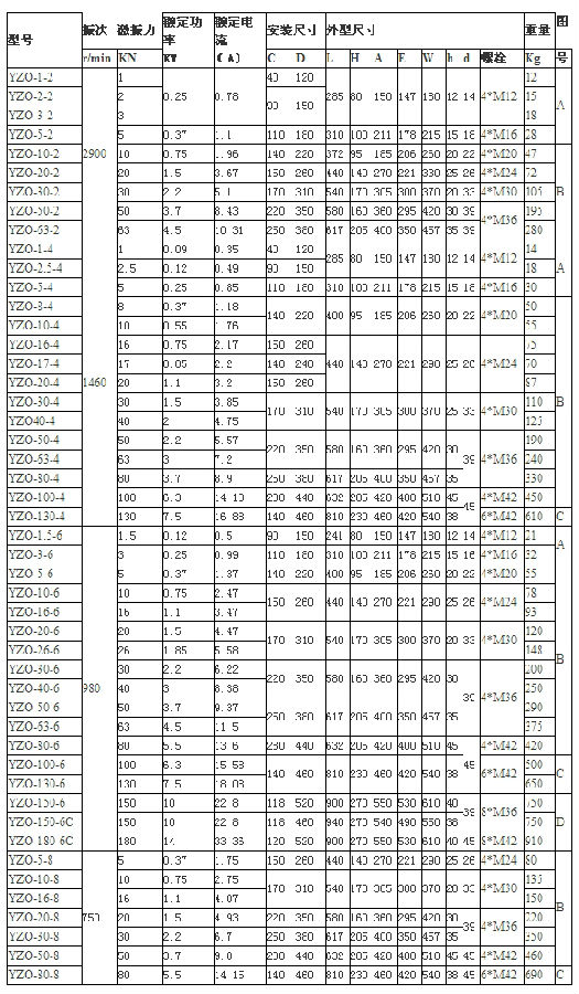 YZS振動(dòng)電機(jī)參數(shù)對(duì)照表: