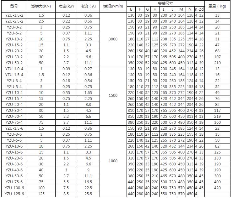 YZU振動電機(jī)的技術(shù)參數(shù)表