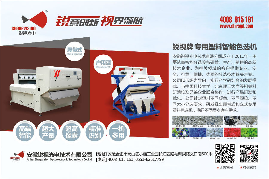 安徽銳視光電技術(shù)有限公司成立于2011年,主要從事智能分選設(shè)備研發(fā)、生產(chǎn)、銷售的高新技術(shù)企業(yè)。為相關(guān)領(lǐng)域的客戶提供專業(yè)、安全、可靠、便捷、優(yōu)質(zhì)的分選技術(shù)解決方案。公司以市場為導向,實行產(chǎn)學研結(jié)合的發(fā)展模式。與中國科技大學、北京理工大學等相關(guān)科研院校及兄弟企業(yè)聯(lián)合協(xié)作,進行產(chǎn)品研發(fā)和優(yōu)化。公司針對塑料不同顏色、不同顆粒、不同大小分選要求,研發(fā)推出履帶式和立式塑料推薦色選機,滿足不同層次客戶需求。