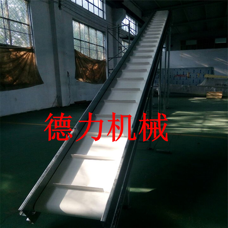 爬坡皮帶輸送機(jī)適用于樓層或高差間的貨物的連續(xù)輸送。傾斜角度?。ā?0°)的爬坡皮帶機(jī),在皮帶上加裝檔條、治具、裙邊等方式從而使物體能在較大的角度上作提升輸送。具有效率高、輸送快、噪音低、不間斷等特點(diǎn)。特別適合小物料的輸送,如食品、注塑件、粉末以及各種零件行業(yè)。用于上下樓層、斜坡地形、天橋等具有高差的平面之間的物品輸送。在某些情況下可以代替升降機(jī)使用。在輸送顆粒狀物品時(shí)為防止物品因重力滾落,每隔一段距離可以加一塊擋板.