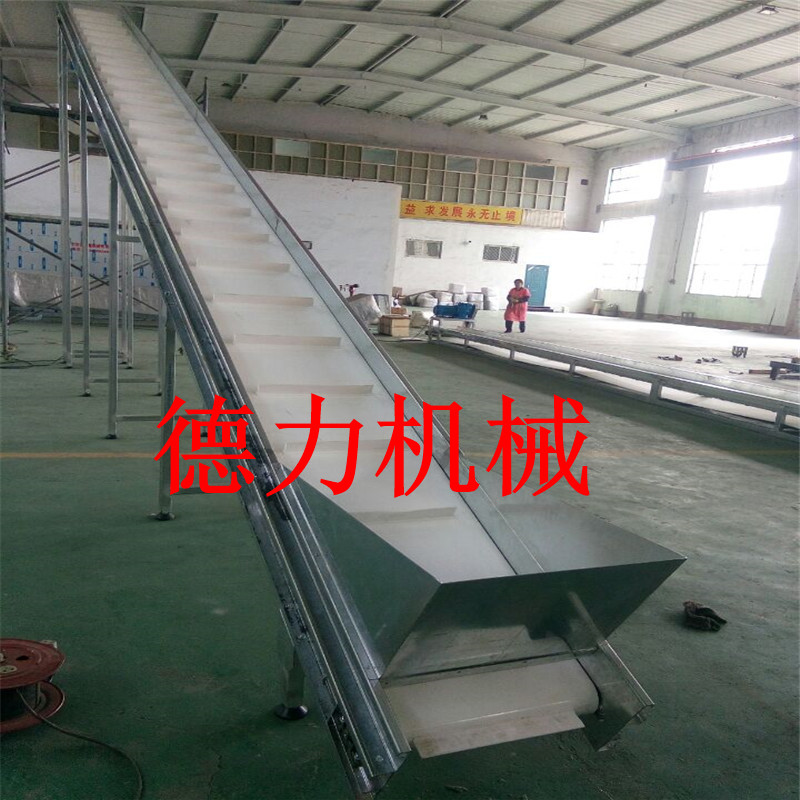 爬坡皮帶輸送機(jī)適用于樓層或高差間的貨物的連續(xù)輸送。傾斜角度?。ā?0°)的爬坡皮帶機(jī),在皮帶上加裝檔條、治具、裙邊等方式從而使物體能在較大的角度上作提升輸送。具有效率高、輸送快、噪音低、不間斷等特點(diǎn)。特別適合小物料的輸送,如食品、注塑件、粉末以及各種零件行業(yè)。用于上下樓層、斜坡地形、天橋等具有高差的平面之間的物品輸送。在某些情況下可以代替升降機(jī)使用。在輸送顆粒狀物品時(shí)為防止物品因重力滾落,每隔一段距離可以加一塊擋板.