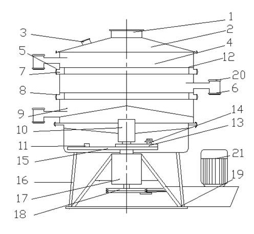 1. 觀察口2.出料口3.底框4. 驅動軸5.拉簧6.加油口7.主軸8.底座9.皮帶輪10.皮帶11.電機12. 偏心機構13.防護罩14.加油口15.鎖緊裝置16.篩格17.密封蓋18.進料口