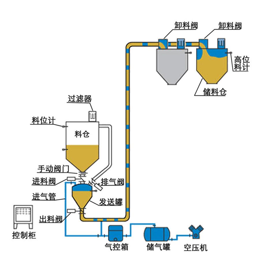 稀相氣力輸送是在整個管道系統(tǒng)的壓力大于當地氣壓的連續(xù)無間隙輸送方式的統(tǒng)稱。氣體壓力低于0.1Mpa,正壓稀相輸送主要特點為輸送量大,輸送距離長,操作穩(wěn)定。