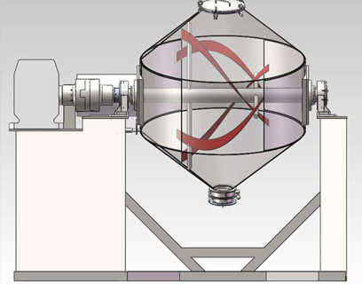 雙錐混合機(jī)由轉(zhuǎn)桶、設(shè)備支架、動(dòng)力部分組成。轉(zhuǎn)桶設(shè)計(jì)為雙錐等各種形式、同時(shí)在筒體內(nèi)設(shè)計(jì)成不同的葉片形式、筒體轉(zhuǎn)動(dòng)時(shí)、物料在桶體內(nèi)不斷的提升、拋灑、交錯(cuò)、達(dá)到快速混合的效果,較后達(dá)到均勻混合,整個(gè)混合過(guò)程筒體在不斷的翻轉(zhuǎn),筒體內(nèi)所有物料都得到運(yùn)動(dòng),混合無(wú)死角。物料必須具有流動(dòng)性、有粘稠性物料不能夠拋灑.混合過(guò)程必須停機(jī)加料、生產(chǎn)只能批次性進(jìn)行,生產(chǎn)效率不高。