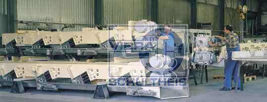 圖4:共振槽式輸送機(jī)的組裝線,振動馬達(dá)置于頂部。