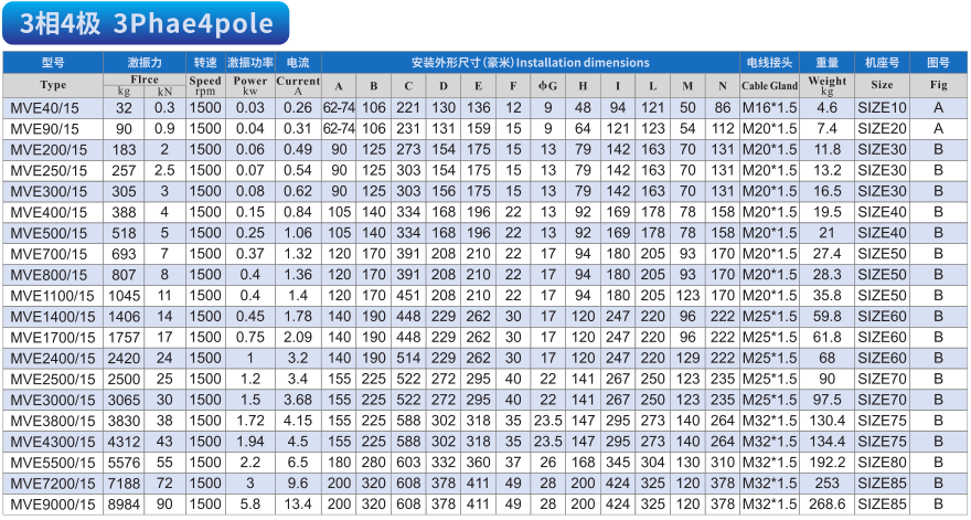 MVE300/3是一款三相異步振動電機(jī),電壓380V,激振力3KN,也就是300KG左右,轉(zhuǎn)速大概3000轉(zhuǎn)每分鐘,功率160W,滿載運(yùn)行6.25個小時才需要用到1度電,名副其實(shí)的節(jié)能王。