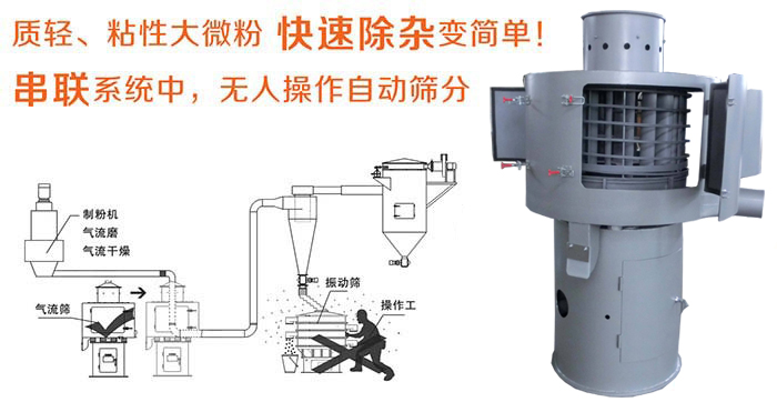 立式氣流篩分機(jī)是利用粉料微粒質(zhì)量小而輕、易漂浮、流動性好的特點(diǎn),將其充分?jǐn)U散到氣流中,粉料不再團(tuán)聚,而是以單個微粒依次隨氣流透過篩網(wǎng),因此氣流篩的產(chǎn)量大、效率高、不粘網(wǎng)、不堵網(wǎng)孔、細(xì)度有效。