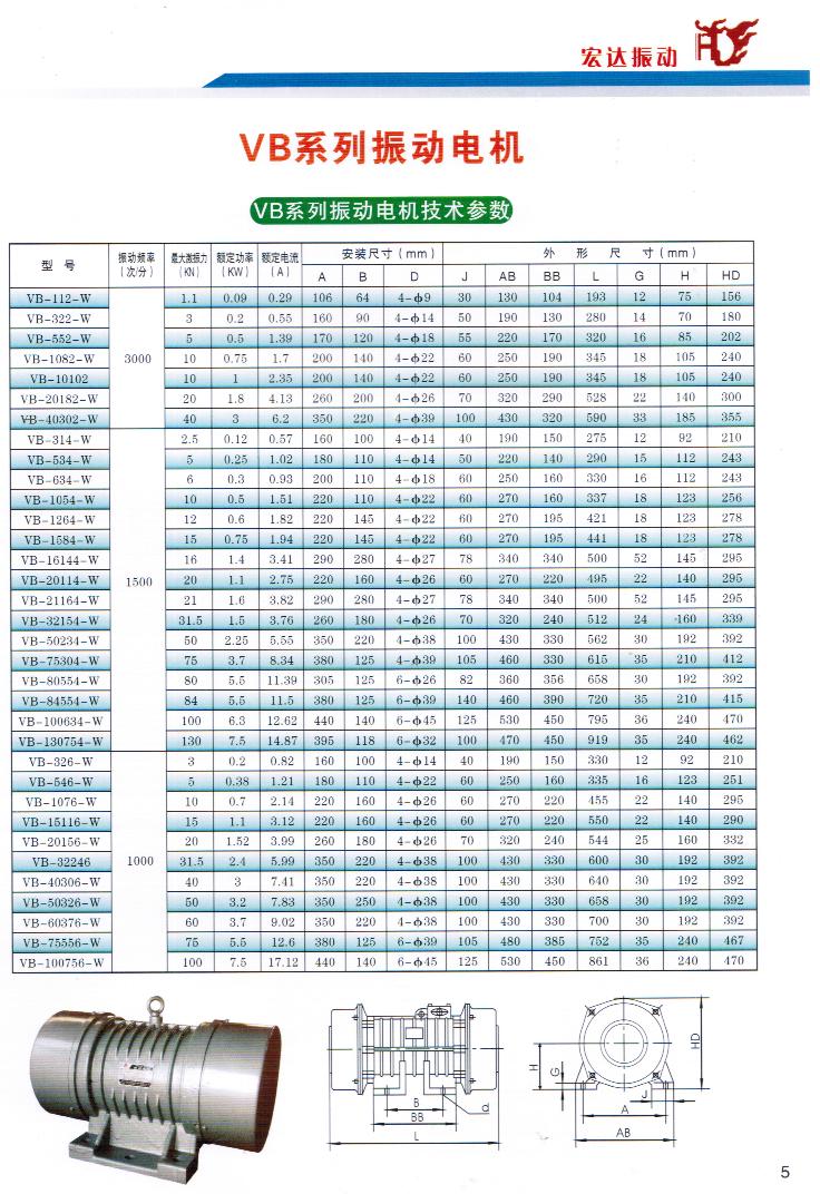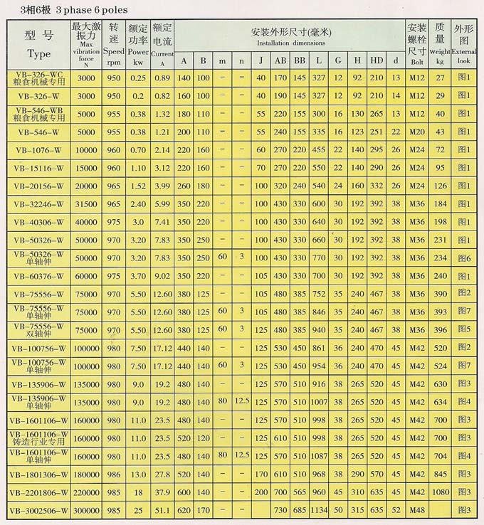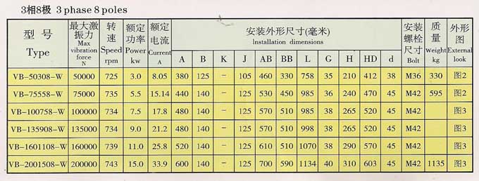 VB振動電機的各項參數(shù)和其它系列的振動電機都可以互相通用,多用于各種型號的振動篩分設(shè)備作為主要振動力來源,具體型號可參考下表。