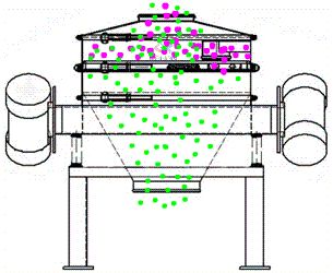 直排篩利用振動(dòng)電機(jī)利用其軸上下端的兩組偏心塊(不平衡偏心塊)的相位角以及兩臺(tái)電機(jī)之間的交叉角度將振動(dòng)電機(jī)的旋轉(zhuǎn)運(yùn)動(dòng)變?yōu)樗?、垂直、傾斜以及離心作用的多作用力重疊,再將這種作用力傳遞給篩面,從而達(dá)到篩分的目的。改變上下偏心塊的相位角和重量,可以改變激振力的大小和物料的運(yùn)動(dòng)軌跡。