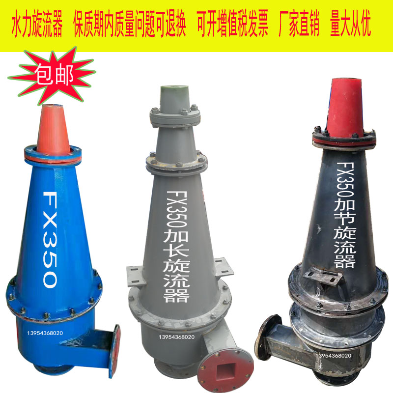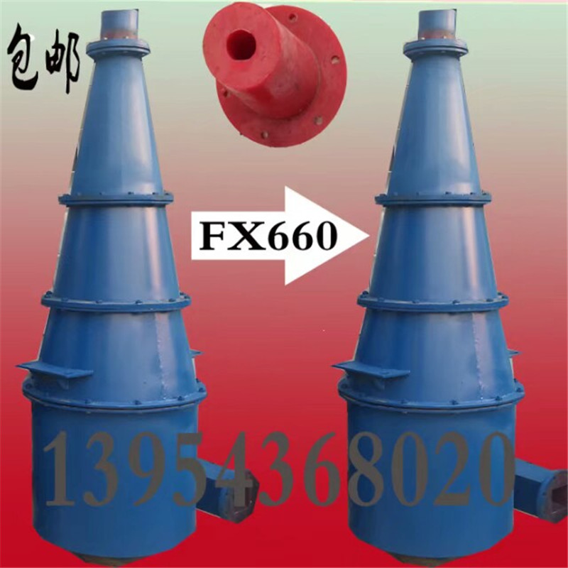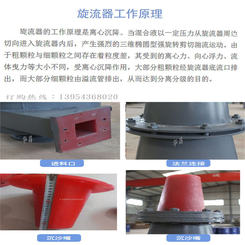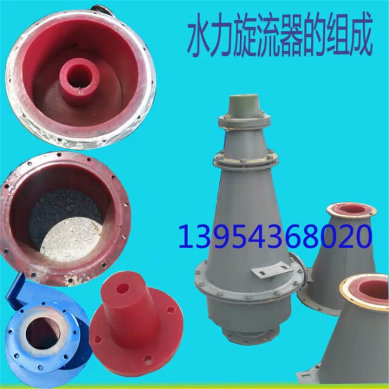 水力旋流器的構(gòu)造:上部為圓錐形。在圓柱形筒體上裝有與筒壁呈切線方向的給礦管。圓錐上部裝有與圓柱部分相連通的中心溢流管。溢流管的上端則通過緩沖室或直接與外部管道聯(lián)接以排出溢流。在圓錐形底部裝有沉砂咀,以排出粗粒沉砂。為了減不磨損,可在給礦口、沉砂咀及筒體內(nèi)壁襯以耐磨橡膠或用輝綠巖、鑄石、碳化硅等耐磨材料
