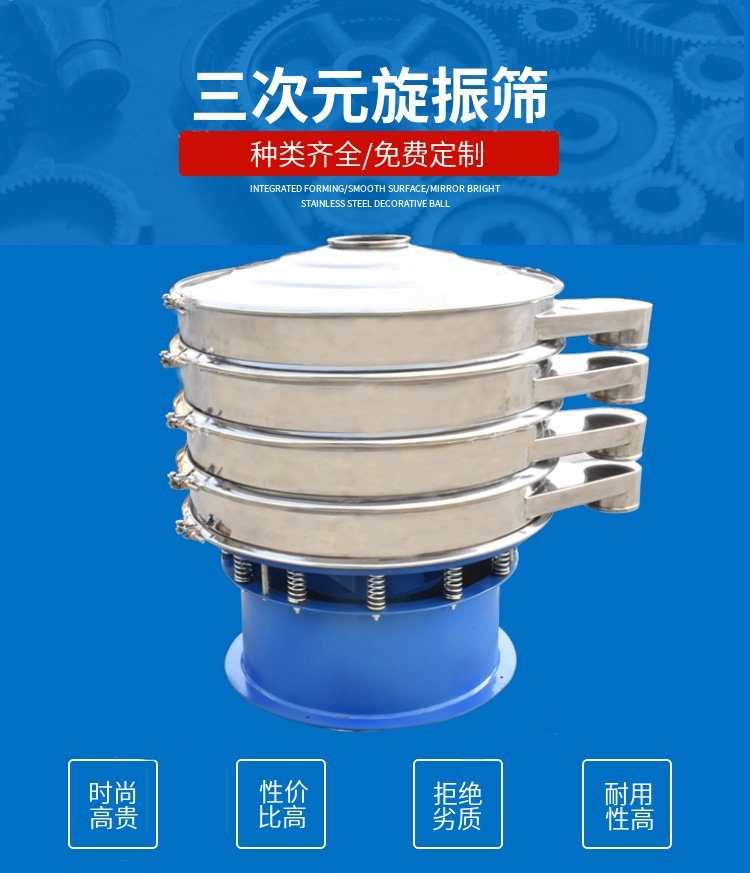 旋振篩又稱三次元旋振篩,是由高強(qiáng)度直立式振動電機(jī)產(chǎn)生激振源,電機(jī)軸承上、下兩端均安裝有