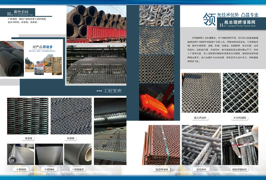 • 主營(yíng)產(chǎn)品:我公司生產(chǎn)各種規(guī)格型號(hào)礦篩網(wǎng)、編織網(wǎng)、軋花網(wǎng)、沖孔網(wǎng)、鋼板網(wǎng)、聚氨酯篩網(wǎng)、鋼筋網(wǎng)、不銹鋼網(wǎng)、焊接網(wǎng)、不銹鋼網(wǎng)帶、等絲網(wǎng)深加工產(chǎn)品。