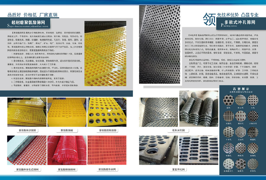 我公司擁有40余年的篩網(wǎng)生產(chǎn)經(jīng)驗(yàn),專業(yè)生產(chǎn)礦山振動(dòng)篩篩網(wǎng)、高錳鋼編織篩網(wǎng)、不銹鋼篩網(wǎng)、防堵篩網(wǎng)、熱處理焊接篩網(wǎng)、聚氨酯類篩網(wǎng)篩板、鋼板沖孔網(wǎng)、鍍鋅網(wǎng)、建筑網(wǎng)片、掛鉤螺絲、膠條、托輥等礦山配件。