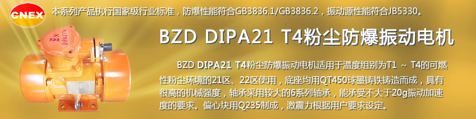 BZD系列DIPA21粉塵防爆振動電機(jī):簡稱BZD粉塵防爆振動電機(jī),適用于溫度組別為T1 ~ T4的可燃性粉塵環(huán)境的21區(qū)、22區(qū)使用。