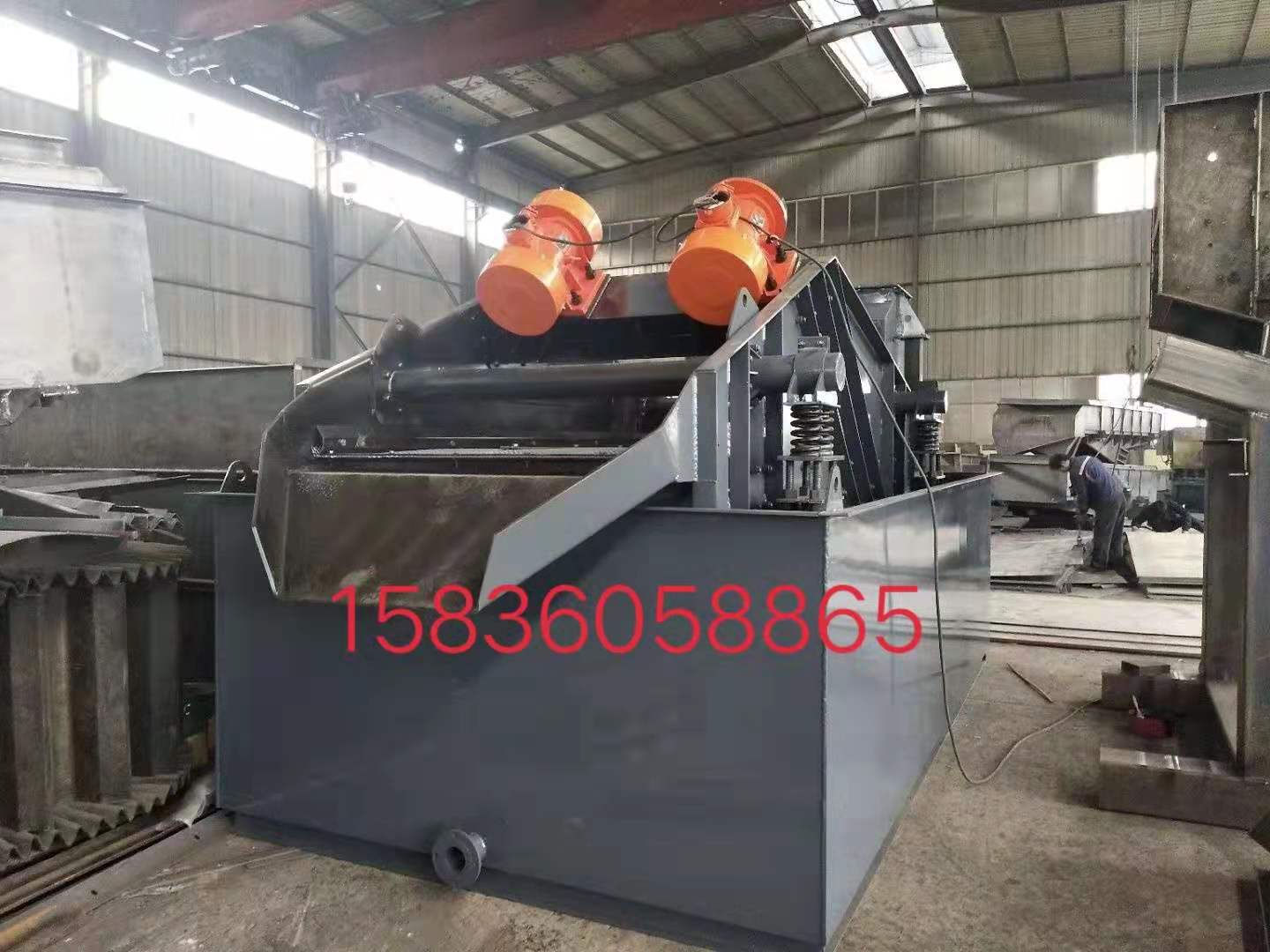 篩箱依靠兩臺振動電機(jī)做相反方向自同步旋轉(zhuǎn),使支承在減振器上的整個篩機(jī)做直線振動,物料從入料端落入篩箱后,迅速前進(jìn)、松散、透篩,完成篩分作業(yè)。