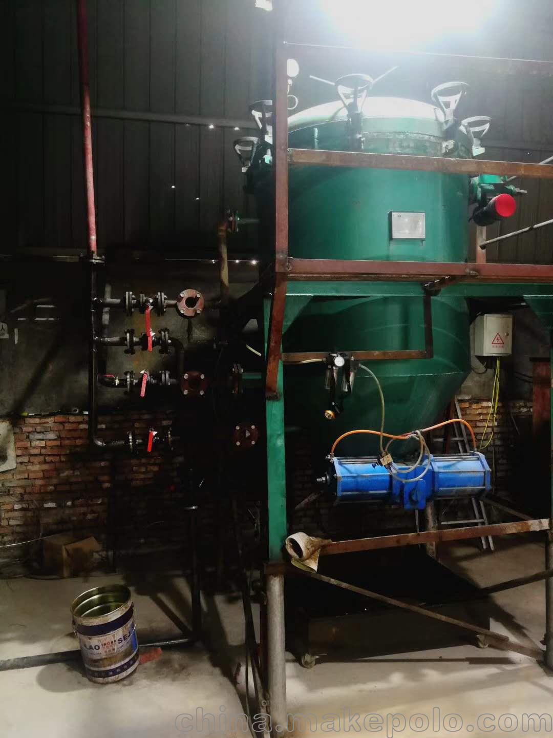隨著過濾量的不斷增加,被截留在濾網(wǎng)表面的白土等固體雜質(zhì)越來越多,使濾餅層厚度不斷增加,過濾阻力增大,筒體內(nèi)部壓力升高,當(dāng)壓力升到 0.45MPa 時(shí)需要排渣,停止向筒體內(nèi)輸入待濾液,關(guān)閉泵,然后通入空氣吹干濾餅。濾餅吹干后關(guān)閉空氣閥門,當(dāng)筒體上方壓力表顯示為 0 時(shí),打開蝶閥,啟動振動排渣裝置,使濾板振動,濾網(wǎng)表面的濾餅振落經(jīng)罐體下方排渣口排出。