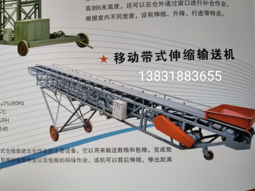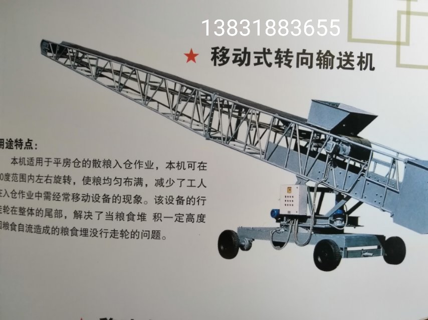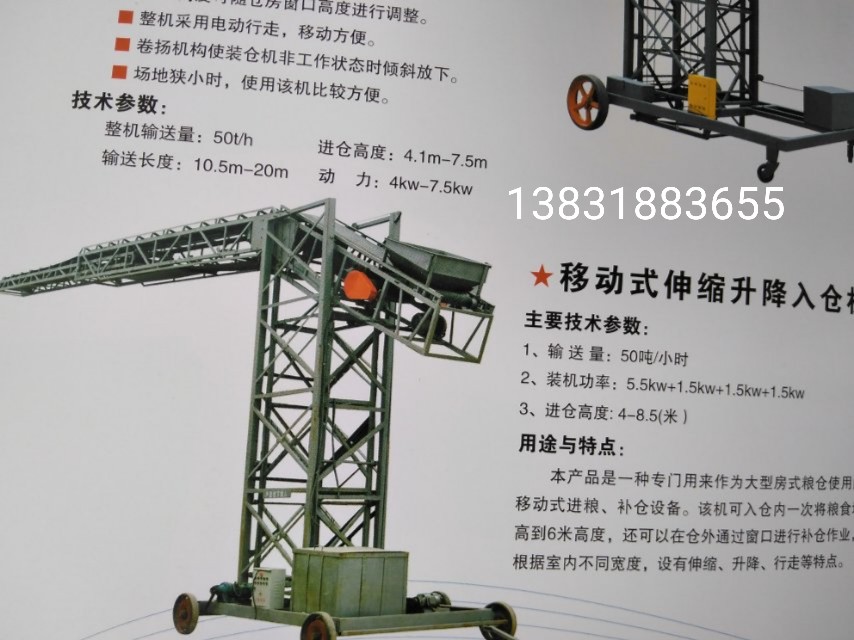 3、移動式補倉機具有液壓升降和電動伸縮功能,適用于糧食倉庫倉外散糧補倉或倉內(nèi)堆高作業(yè);能在滿負載狀態(tài)下,連續(xù)、穩(wěn)定、可靠的將糧食堆入倉庫內(nèi),完成散糧的進倉作業(yè),也可以將其懸臂形式的伸縮輸送機從平房倉的窗口插入倉內(nèi),進行散糧的補倉作業(yè)。(伸縮功能根據(jù)用戶需求配置)