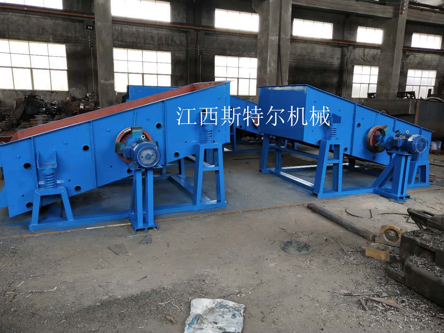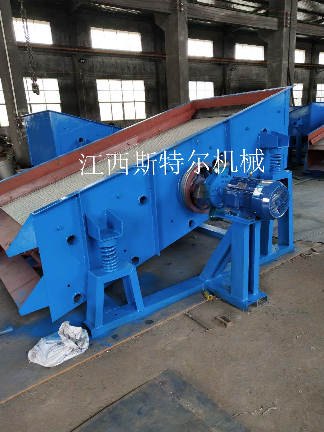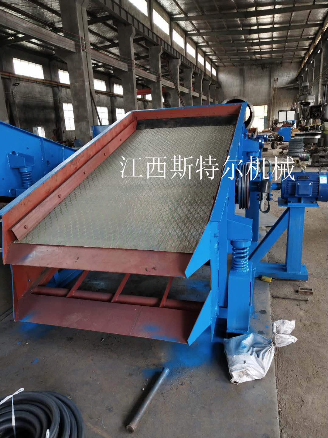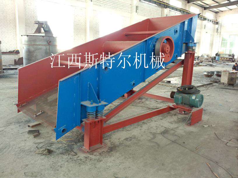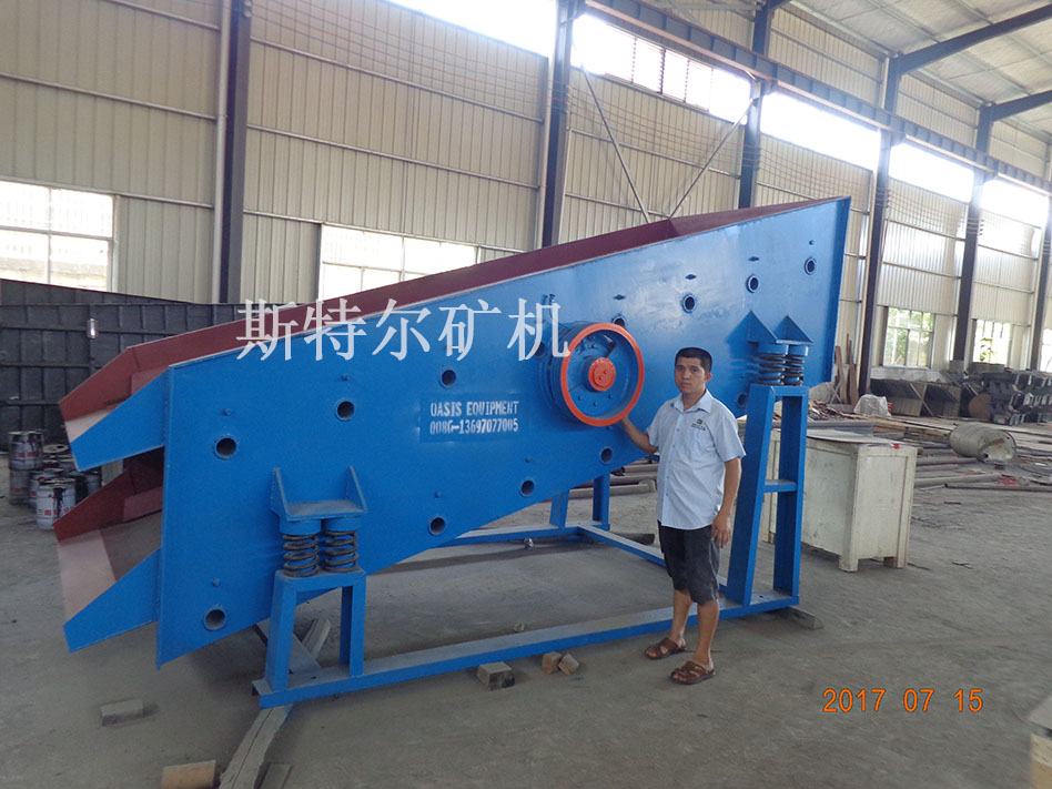 直線振動篩采用振動電機(jī)驅(qū)動,當(dāng)振動電機(jī)做同步、反向旋轉(zhuǎn)時,其偏心塊所產(chǎn)生的激振力在平行于電機(jī)軸線的方向相互抵消,在垂直于電機(jī)軸的方向疊為一合力,因此篩機(jī)的運動軌跡為一直線。其電機(jī)軸相對篩面有一傾角,在激振力和物料自重力的合力作用下,物料在篩面上被拋起跳躍式向前作直線運動,從而達(dá)到對物料進(jìn)行篩選和分級的目的??捎糜诹魉€中實現(xiàn)自動化作業(yè)。具有能耗低、結(jié)構(gòu)簡單、易維修、全封閉結(jié)構(gòu)無粉塵溢散的特點。篩分目數(shù)細(xì)100目,可篩分出不同粒度的物料。