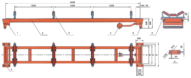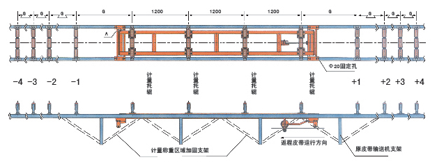 說明:1、稱重架 2、稱重橋 3、原輸送機托輥改制的計量托輥 4、測速車及測速傳感器 5、輔助輥 6、輸送機框架