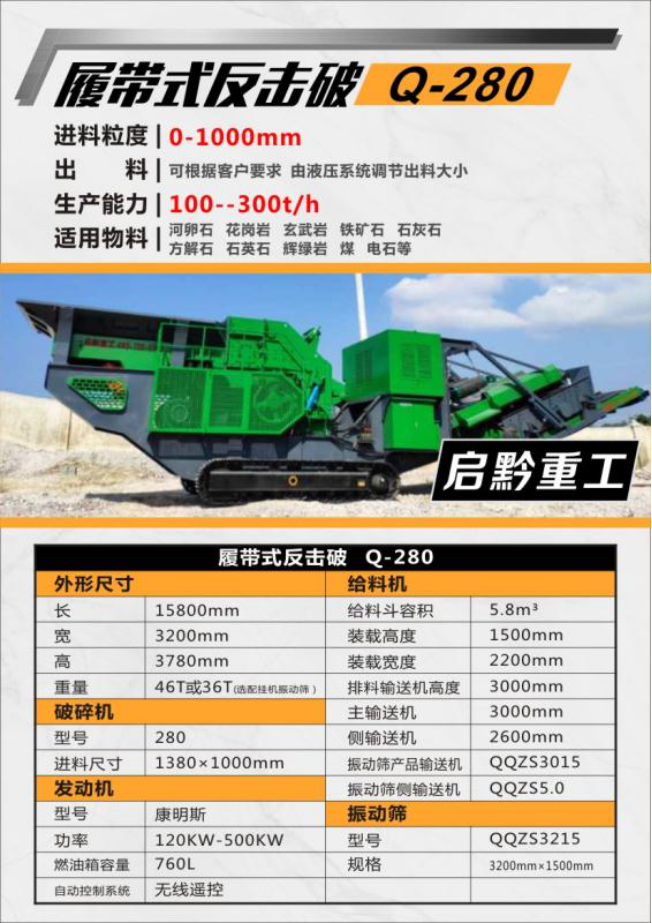 Q-280履帶式反擊破結(jié)合了移動靈活性與高產(chǎn)的應(yīng)用特點(diǎn)。配備專業(yè)的反擊式破碎機(jī)和高質(zhì)量的板錘實(shí)現(xiàn)強(qiáng)大破碎性能。機(jī)械式直驅(qū)破碎設(shè)計(jì),并配以輔助啟動和制動裝置,降低運(yùn)行成本的同時提高可靠性,較大程度的為客戶創(chuàng)造價值。