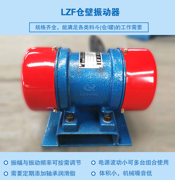 LZF倉壁振動器是以振動電機為激振源的通用型產品,它是靠高頻振動和沖擊力,有效地消除由于內摩擦、潮解、帶電、成分偏析等原因而引起的架橋、搭拱、堵塞等現象,從而使物料從倉口順利排出,保證穩(wěn)定供料所必需的設備。