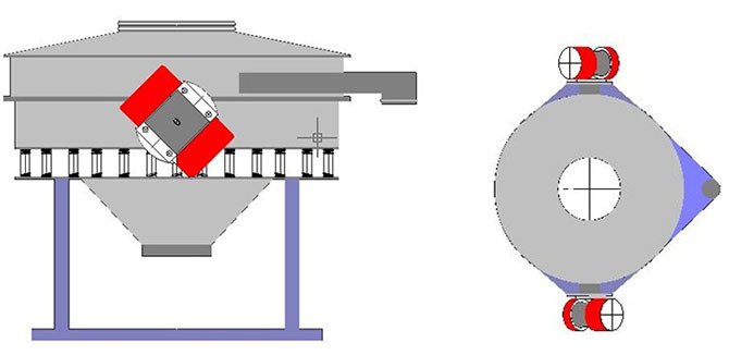 振動電機(jī)利用其軸上下端的兩組偏心塊(不平衡偏心塊)將振動電機(jī)的旋轉(zhuǎn)運動變?yōu)樗?、垂直、傾斜以及離心作用的多作用力重疊,再將這種作用力傳遞給篩面,從而達(dá)到篩分的目的。改變上下偏心塊的相位角和重量,可以改變激振力的大小和物料的運動軌跡。直排篩的篩下物出料口采用直排篩式結(jié)構(gòu),以此提高了排料速度和排料量,更適合物料除雜等粗略篩分等工藝。