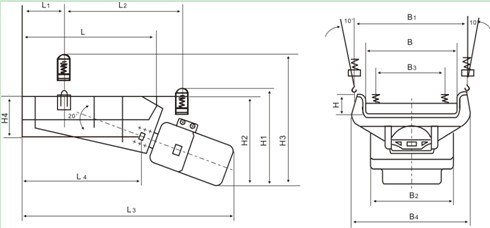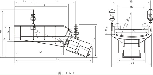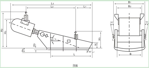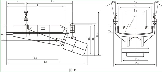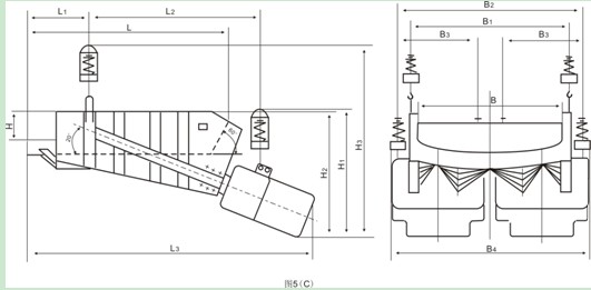 (1)本系列電振機(jī)均為懸掛式安裝,其中振動(dòng)器的懸掛杠桿應(yīng)垂直吊掛,為了減少給料機(jī)的橫向擺動(dòng),給料槽懸掛吊桿應(yīng)向外張開10。布置。四個(gè)懸掛吊桿吊掛在具有足夠剛度的結(jié)構(gòu)上,對(duì)于大型給料機(jī)為了維修和更換料槽方便,應(yīng)布置移動(dòng)滑架懸掛吊桿。