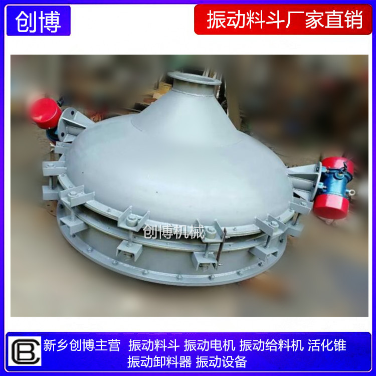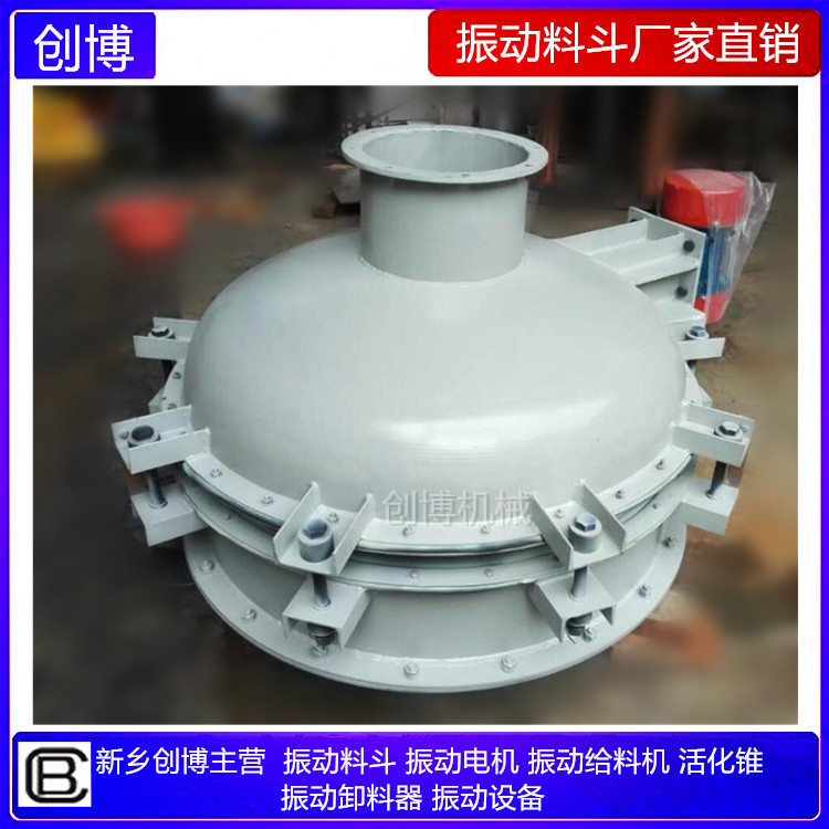 振動料斗的工作原理:將振動電機接通電源,振動電機起振。其產生的激振力使給料斗下體在水平方向產生強烈的振動,此振動通過錐面或球面活化器將水平激振力分解為法向力和切向力,法向力呈放射狀傳遞到物料深處,切向力使物料受剪,從而消除倉內物料的起拱,使物料像流水一樣從出料口排出。切斷電源,振動電機停振,排料可停止。