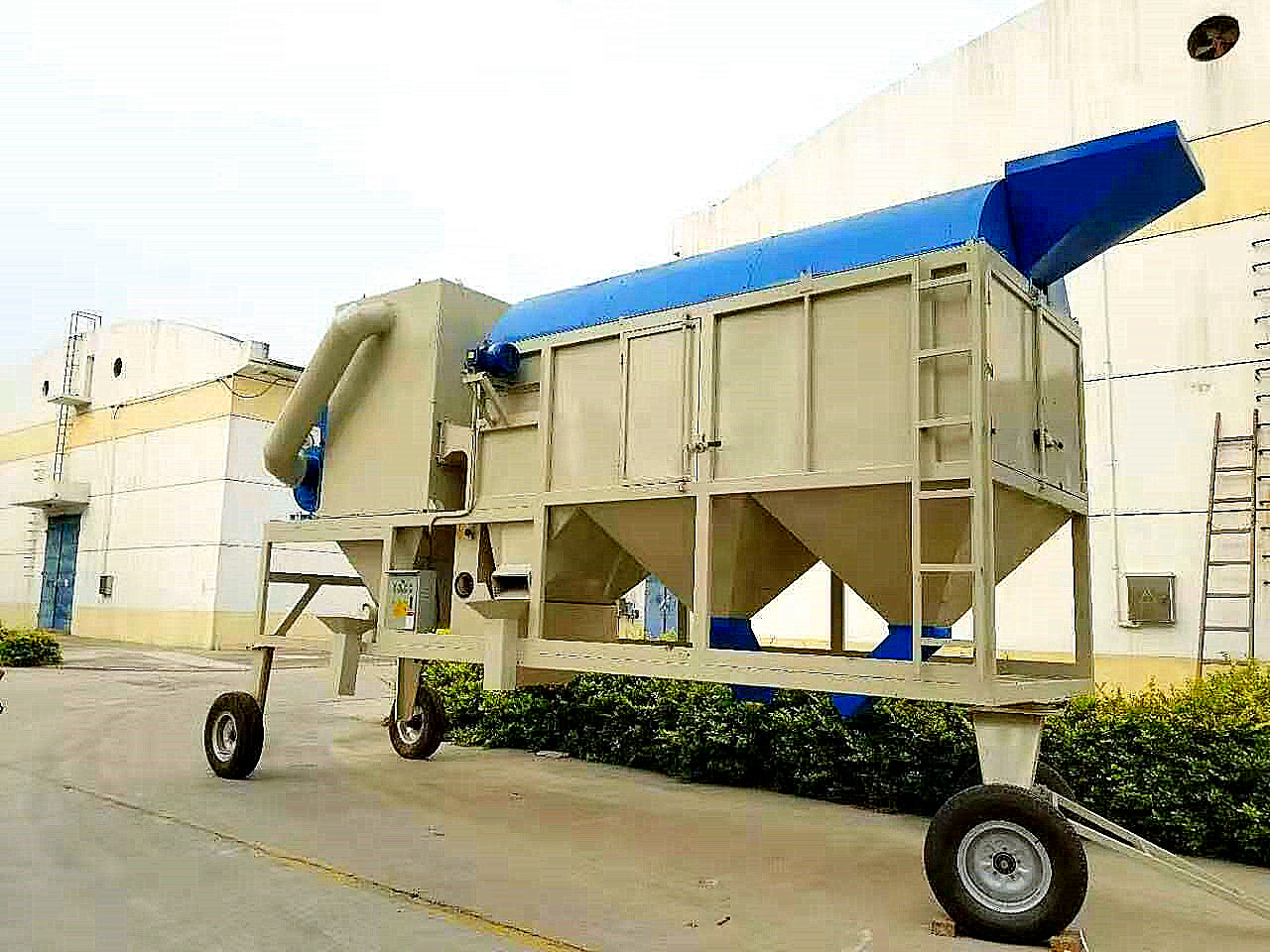 玉米環(huán)保除塵清理篩是按物料的密度、厚度和直徑的大小分離凈糧口和雜質(zhì)的,風選是按物料的比重不同分離凈糧和輕雜質(zhì)。其工藝流程是:原糧進入糧斗,自動流入內(nèi)篩筒,小于內(nèi)篩孔眼的物料落入振動篩,大于內(nèi)篩孔眼的大雜留在內(nèi)篩筒內(nèi)并流向尾端進入大雜出口,留在外篩孔的物料進入振動篩,由振動把物料中的細雜質(zhì)篩出,細雜流入出雜口。物料再次進入風箱,風選把空殼、中雜、毛糠等雜質(zhì)吸入脈沖箱內(nèi),雜質(zhì)沉淀再由絞龍把雜質(zhì)排出,凈糧進入出糧口,完成篩選流程。