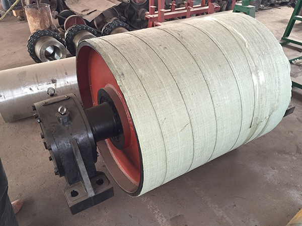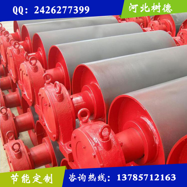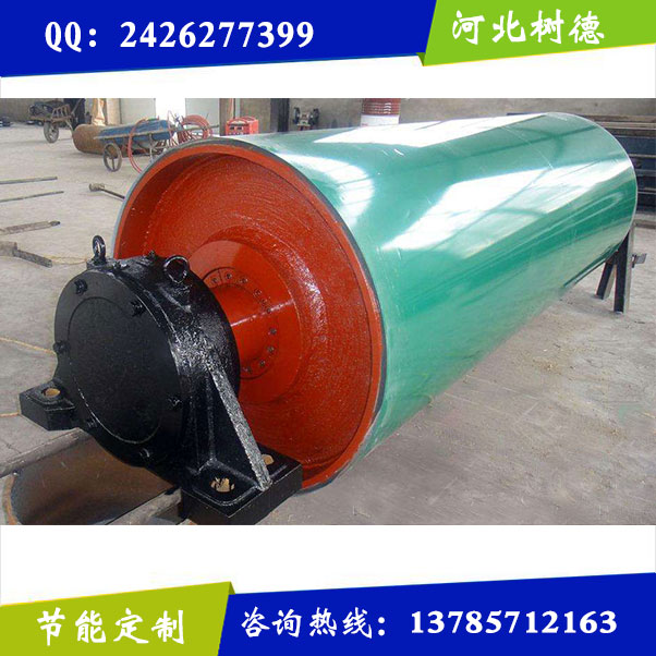 其驅(qū)動帶式輸送機的方式有單滾筒、雙滾筒及多滾筒之分。傳動滾筒表面有裸露光鋼面,人字形和菱形花紋橡膠覆面。傳動滾筒從制作材料上來分有鋼板卷制焊接、鑄鋼及鑄鐵3種。從結(jié)構(gòu)型式上來分有裝配輻板式、輻條式、整體輻板式3種。