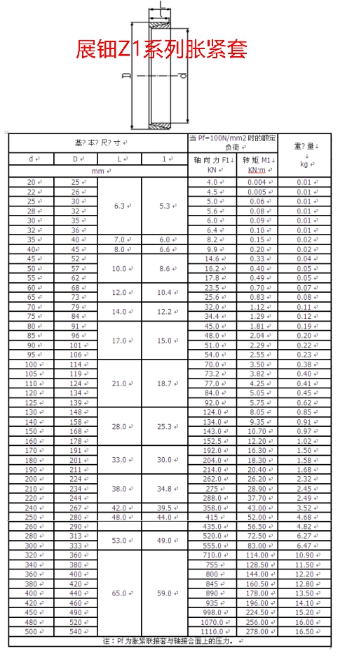 Z1型系列脹緊套型號如下:Z1-9×12Z1-10×13、Z1-11×14Z1-12×15、Z1-13×16Z1-14×18、Z1-15×19、Z1-16×20Z1-17×21、Z1-18×22、Z1-19×24Z1-20×25、Z1-22×26、Z1-25×30、Z1-28×32、Z1-30×35、Z1-32×36、Z1-35×40、Z1-40×45、Z1-45×52Z1-50×57、Z1-55×62、Z1-60×68、Z1-65×73Z1-70×79、Z1-75×84Z1-80×91、Z1-85×96、Z1-90×101Z1-95×106、Z1-100×114Z1-105×119、Z1-110×124、Z1-120×134、Z1-125×139、Z1-130×148、Z1-140×158、Z1-150×168Z1-160×178、Z1-170×191、Z1-180×201、Z1-190×211、Z1-200×224Z1-210×234、Z1-220×244、Z1-240×267、Z1-250×280、Z1-260×290Z1-280×313、Z1-300×333Z1-320×360、Z1-340×380、Z1-360×400Z1-380×420、Z1-400×440Z1-420×460、Z1-450×490Z1-480×520、Z1-500×540。注:Pf為脹緊聯(lián)結(jié)套與軸結(jié)合面上的壓力。