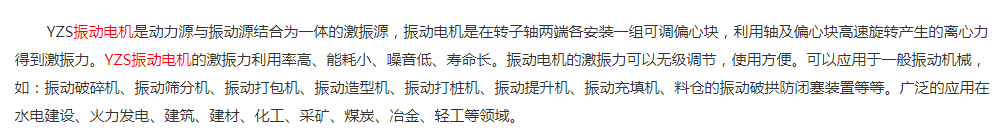 YZS振動(dòng)電機(jī)作為各類振動(dòng)機(jī)械的激振源,如振動(dòng)給料機(jī)、振動(dòng)輸送機(jī)、振動(dòng)放礦機(jī)、振動(dòng)落砂機(jī)、振動(dòng)篩分機(jī),廣泛應(yīng)用于電力、建材、煤炭、礦山、冶金、化工、輕工等行業(yè)。