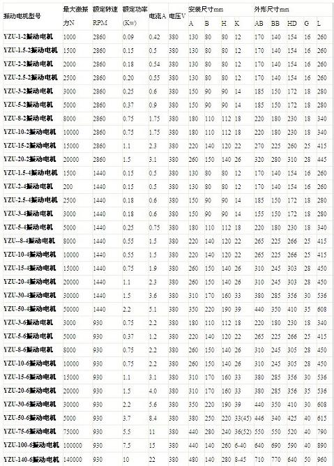 YZU振動(dòng)電機(jī)技術(shù)參數(shù):
