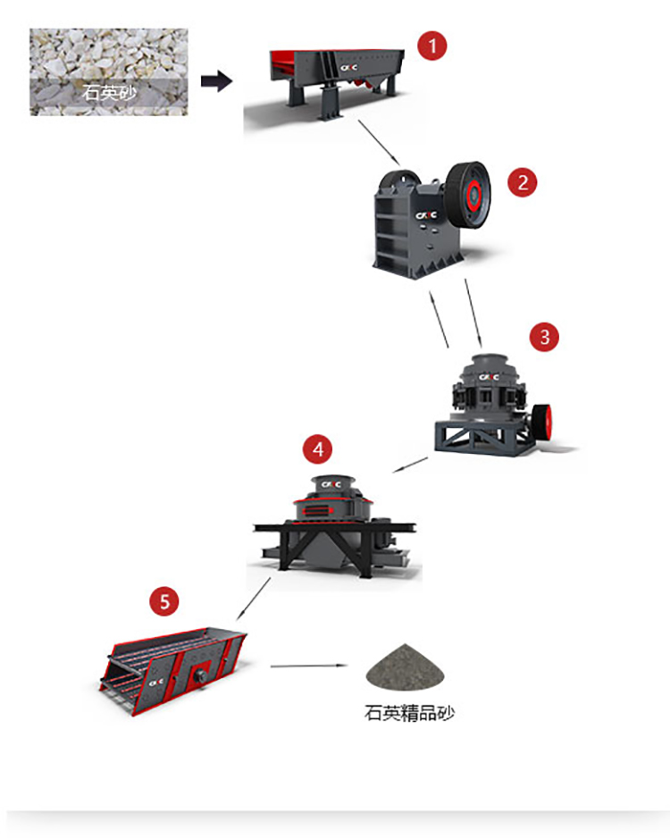 大塊石料經(jīng)料倉由振動給料機均勻地送進顎式破碎機粗碎,粗碎后的石料由皮帶輸送機送到反擊式破碎機細碎,細碎后的石料再由皮帶輸送機送進振動篩篩分,篩分出幾種不同規(guī)格的石子,滿足粒度要求的石子由成品皮帶輸送機送往成品料堆;不滿足粒度要求的石子由皮帶輸送機返料送到制砂機再次破碎,形成閉路多次循環(huán)。