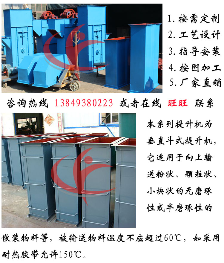 斗式提升機(jī)適用于垂直輸送松散密度1.5t/m3粉狀、粒狀、及小塊狀的磨吸性較小的散狀物料,如糧食、煤、水泥、碎礦石等,提升高度高,物料溫度不超過(guò)60℃