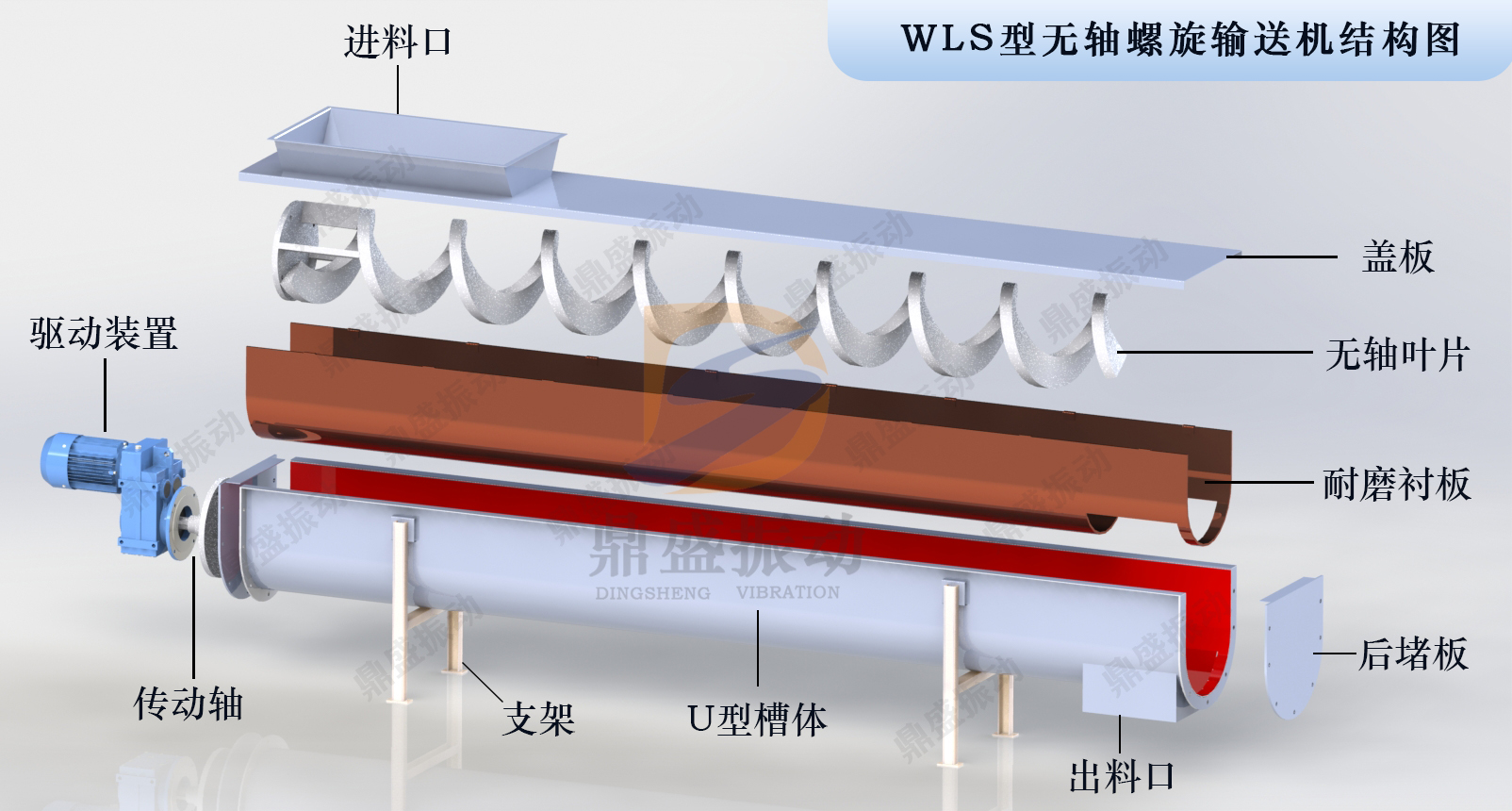 無(wú)軸螺旋輸送機(jī)主要由驅(qū)動(dòng)裝置、頭部裝配、機(jī)殼、無(wú)軸螺旋葉片、槽體襯板、進(jìn)料口、出料口、蓋板、支架等組成。