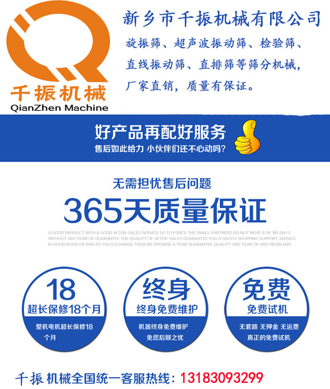 新鄉(xiāng)市千振機械有限公司是直線篩、直線振動篩、圓形振動篩、超聲波振動篩、旋振篩、搖擺篩、直排振動篩、試驗篩、標(biāo)準(zhǔn)檢驗篩、陶瓷中頻高頻振動篩、礦用振動篩等振動篩分設(shè)備的核心制造廠家,現(xiàn)貨供應(yīng)、交貨快,質(zhì)量之選、價格之選、睿智之選。