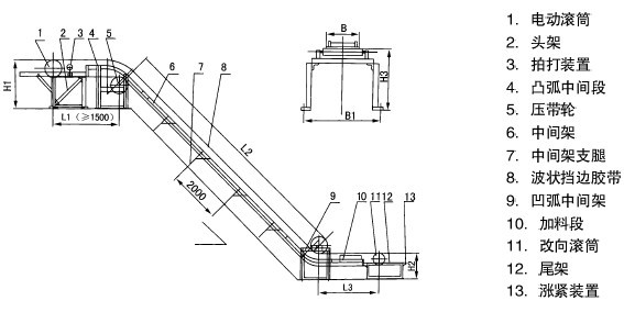 產(chǎn)品概述                                                                                                                                                                                                      DJ系列大傾角擋邊帶式輸送機(jī)(波狀擋邊帶式輸送機(jī))是一種新型連續(xù)輸送設(shè)備,它具有輸送量大(同其它輸送機(jī)相比,輸送能力提高1.5~2倍);其通用性強(qiáng)(基本件與通用型帶式輸送機(jī)相同),適用范圍廣(適用于輸送碎石、石灰石、煤炭、砂、粘土、燒結(jié)砂粉、木屑、糧食等物料;適用于單位質(zhì)量為500~2500kg/m3,最大塊度約為100~250mm的物料);結(jié)構(gòu)簡單、維護(hù)方便、占用空間小且節(jié)省投資(可取代輸送機(jī)、斗提機(jī)聯(lián)合布置形式而直接選用本機(jī)型)便于布置等特點(diǎn),因而在煤炭、電力、冶金、化工、糧食等行業(yè)被廣泛推廣使用。                                 結(jié)構(gòu)圖                                                                                                                                                                                                                                                                                            選型                                                                                                                                                                                     根據(jù)輸送物料特性、傾角及輸送量的大小,參照表1 及表2,確定輸送機(jī)的帶寬,擋邊高及帶速大小。其中: