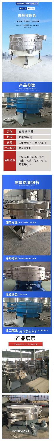 圓形搖擺篩滿足篩分物料要求產(chǎn)量大、精度大、并保持物料顆粒形狀完整性的一款篩機。它采用仿生人工篩分的原理,將手工篩分動作的“篩"-(平面圓周運動)和“簸"-(向上拋物料)這兩種運動形式很好的結(jié)合在一起,解決精細(xì)與超精細(xì)范圍的粉末與顆粒物料的篩分難題。
