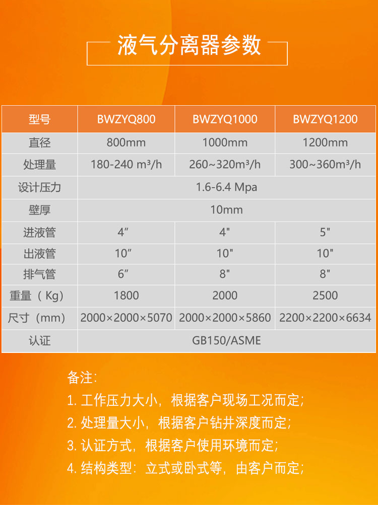 正道能源BWZYQ系列液氣分離器常規(guī)型號(hào)包括 BWZYQ800,BWZYQ1000,BWZYQ1200,有立式液氣分離器和臥式液氣分離器兩種類型,具體液氣分離器參數(shù)規(guī)格參見下方技術(shù)參數(shù)表。