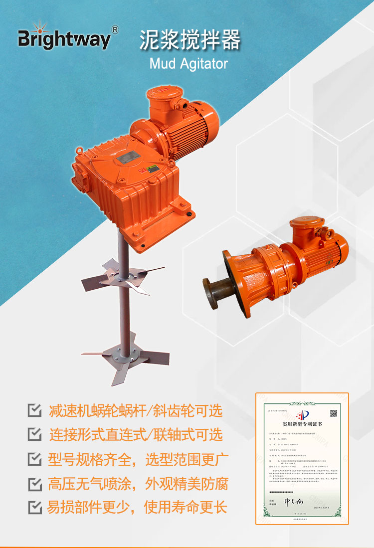 正道能源BWJBQ系列泥漿攪拌器,型號(hào)規(guī)格齊全,包括:臥式和立式泥漿攪拌器; 直連和聯(lián)軸式泥漿攪拌器;蝸輪蝸桿式和斜齒輪式泥漿攪拌器;泥漿攪拌器功率從2.2KW覆蓋到22KW;攪拌器攪拌軸及攪拌葉輪可定制。