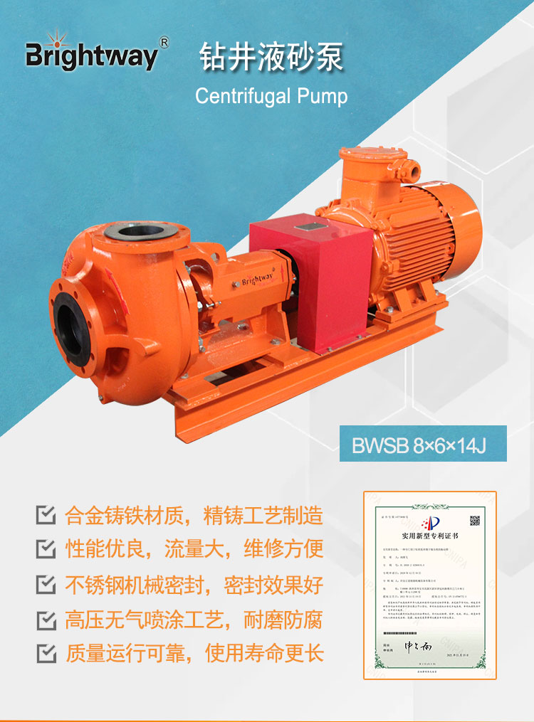 正道能源BWSB系列鉆井液砂泵包括臥式砂泵和立式砂泵,型號(hào)規(guī)格全,選型方便快捷,性能優(yōu)良,可抽磨料、粘性、腐蝕性液體等物料,工作運(yùn)行可靠,使用壽命長,可廣泛應(yīng)用到石油鉆井固控 非開挖工程 污泥脫水工程等領(lǐng)域。是輸送鉆井液 泥漿 污泥的理想選擇。