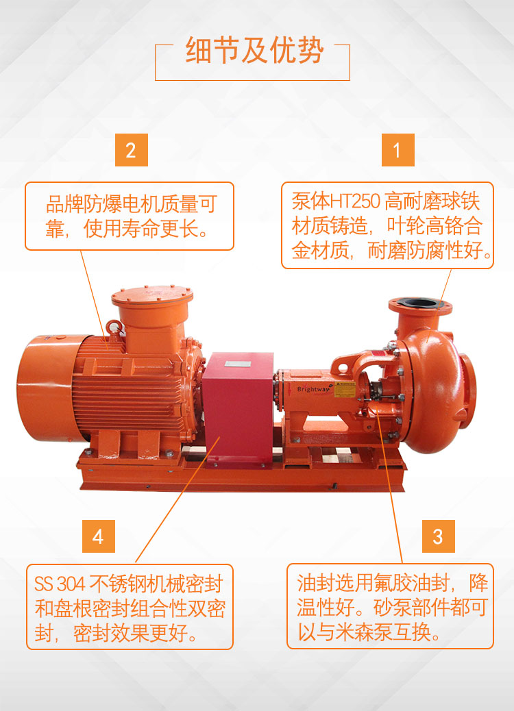 砂泵電機(jī)選用南陽防爆或其他國產(chǎn)品牌電機(jī),質(zhì)量可靠,使用壽命長。
