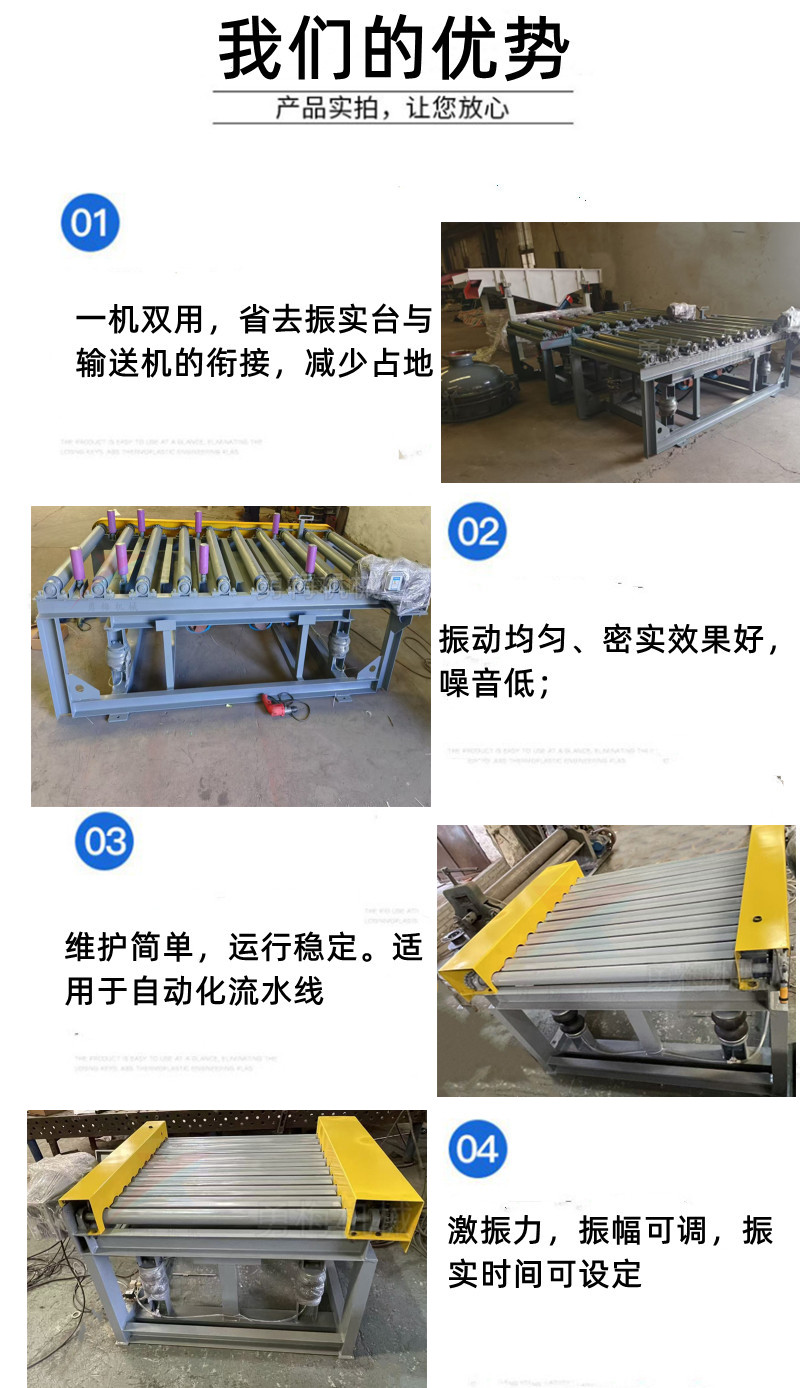 可定時(shí)可調(diào)節(jié)滾動(dòng)振動(dòng)平臺 振實(shí)輸送一體振動(dòng)臺是將物料振實(shí)(排氣、密實(shí)) 與連續(xù)輸送功能集成在同一臺設(shè)備上的流水線專用振動(dòng)設(shè)備,在普通振動(dòng)臺基礎(chǔ)上增加了輸送臺面與協(xié)同控制,臺面系統(tǒng):帶托輥 / 鏈傳動(dòng)的輸送臺面,可邊振動(dòng)邊勻速前進(jìn);材質(zhì)可選碳鋼、不銹鋼;臺面高度可調(diào)、尺寸可定制I77l99582l9。